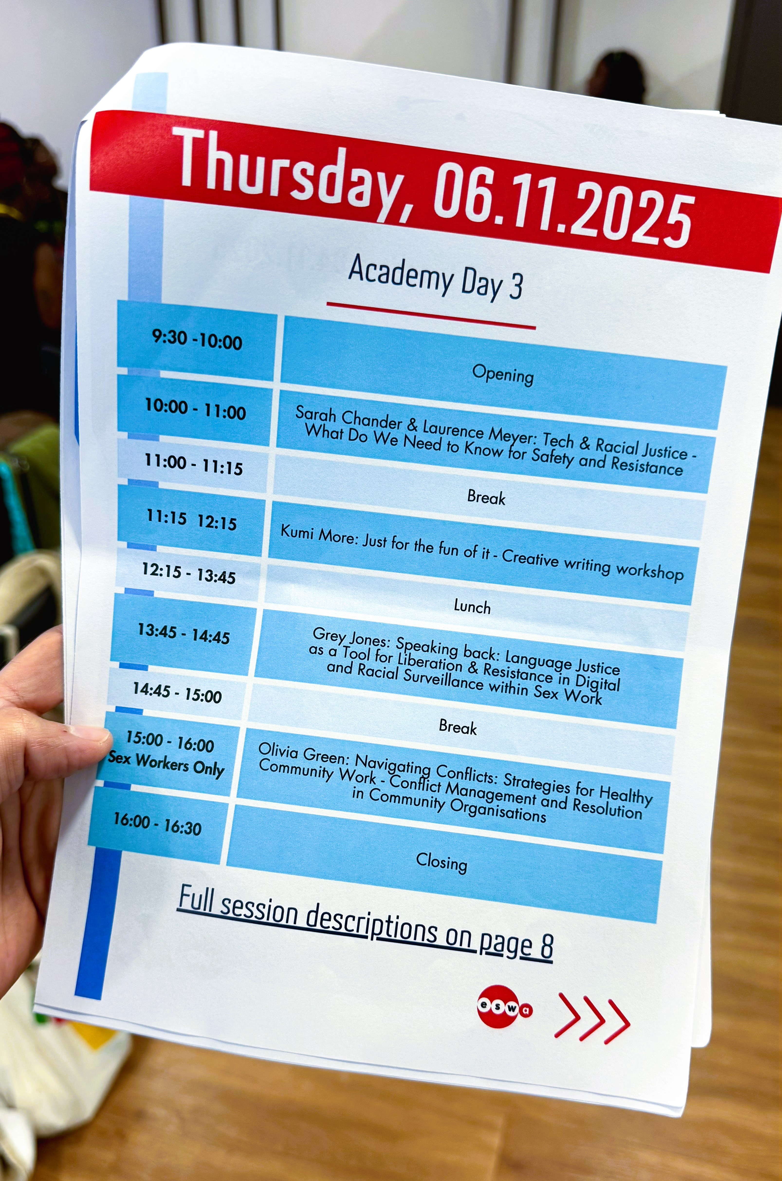 Sex workers were given the opportunity to be treated as experts on digitalisation: session holders spoke about the impacts of border controls and deportation on racialised sex workers; Facial Recognition Technology (FRT)’s proven inherent racial bias and the ways it is mobilised by law enforcement to track sex workers; digital violence against street-based sex workers in Spain and Latin America; the Digital Services Act (DSA) and the AI Act; restorative justice and forms of redress; communications strategies, and ways we can practice care for one another as sex workers, as well as ourselves.